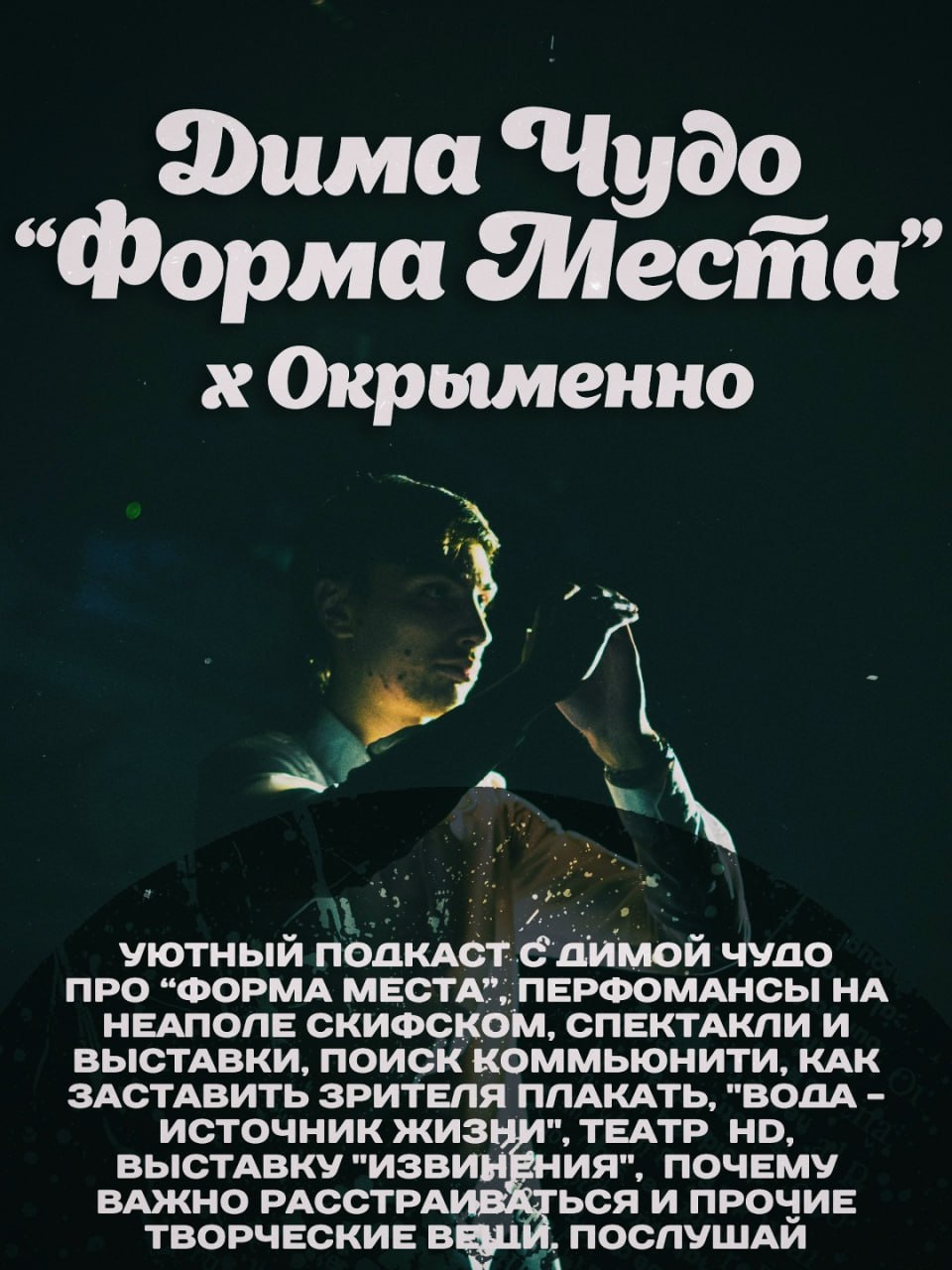Уютный подкаст с Димой Чудо про современное молодёжное арт-коммьюнити "Форма Места" , перфомансы на Неаполе Скифском, спектакли и выставки, как заставить зрителя плакать, "Воду - источник жизни", Театр HD, выставку "Извинения", почему важно расстраиваться и прочие творческие вещи. Послушайте, поставьте лайки и всё будет ОКРЫМЕННО.