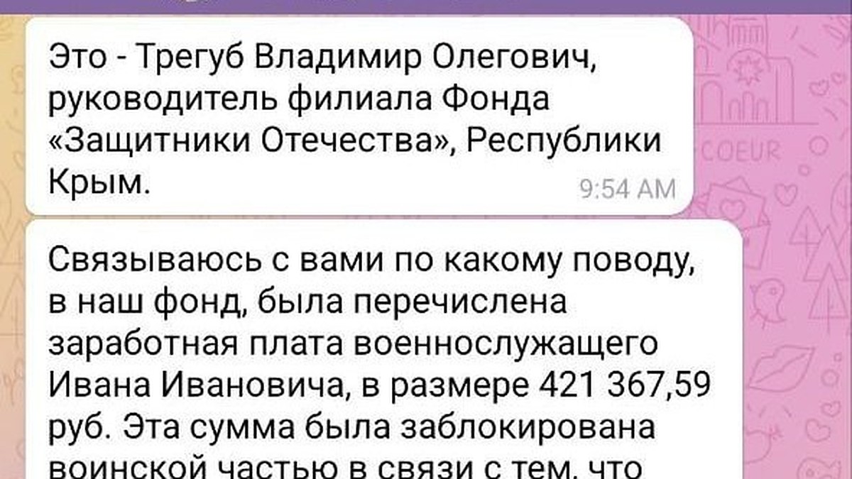 Мошенники под видом руководителя крымского филиала фонда «Защитники Отечества» Владимира Трегуба рассылают фейковые сообщения о начислении заработной платы военнослужащим. Об этом он предупредил в своем Telegram-канале.