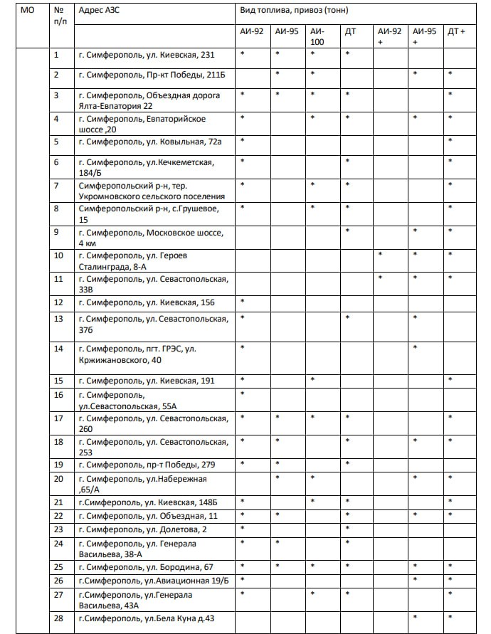 Актуальный перечень адресов АЗС в городе Симферополе, где имеется топливо в свободной продаже (*Данные актуальны на 24.10.2025 года 08:00)