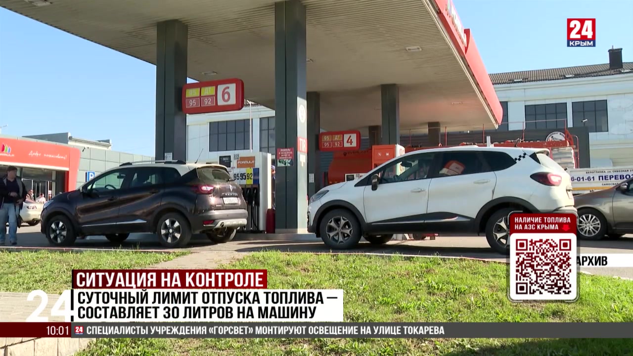 Сегодня бензин можно приобрести на 150 АЗС, сообщил председатель Совета министров Республики Юрий Гоцанюк. Актуальный список адресов и дополнительная информация представлены на официальных ресурсах регионального министерства топлива и энергетики – перечень доступен также по QR-коду, который вы видите на экране. Добавлю, узнать больше о наличии бензина можно и по телефонам «горячей линии» – они также опубликованы в социальных сетях и на страницах профильного ведомства.