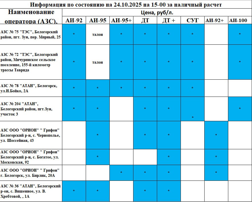 Актуальная информация по наличию топлива на АЗС в Белогорском районе по состоянию на 15.00 24 октября.