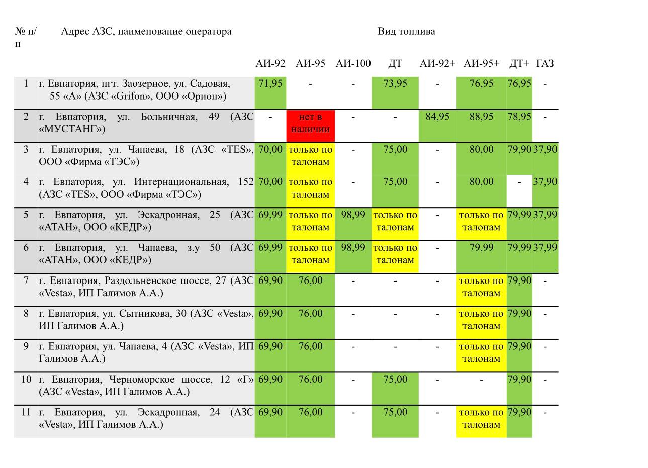 Публикуем данные о наличии топлива на АЗС Евпатории.