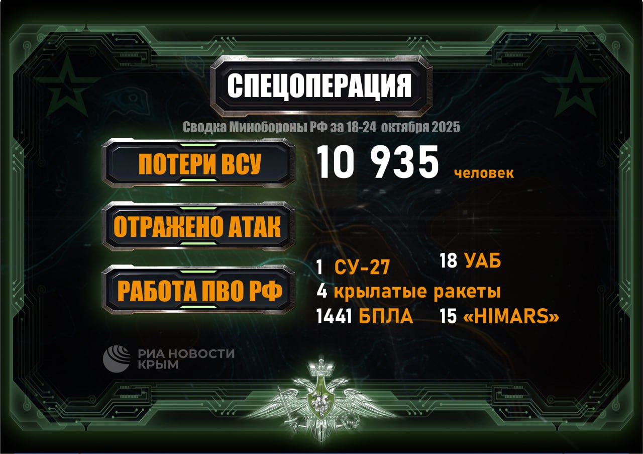 Фронтовая сводка 24 октябряНа Херсонском направлении ВС РФ очень плотно работают артиллерией и дронами по технике противника в Херсоне и о. Карантинный. Противник 47 раз обстрелял левобережье. В Алёшках погиб мирный житель.На Запорожском участке в...