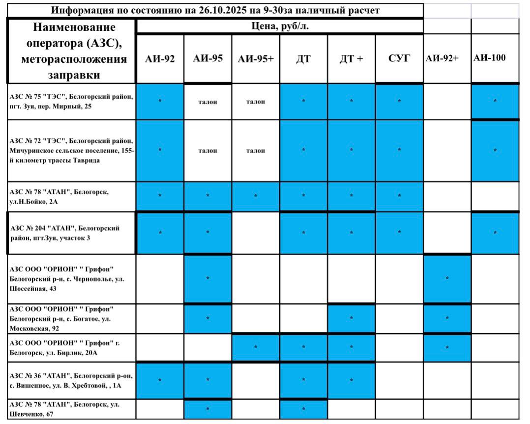 Актуальная информация по наличию топлива на АЗС в Белогорском районе по состоянию на 09.30 26 октября.