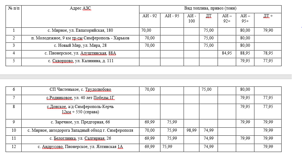 Актуальные данные о наличии топлива на автозаправочных станциях расположенных на территории Симферопольского района реализуемого за наличный расчет.