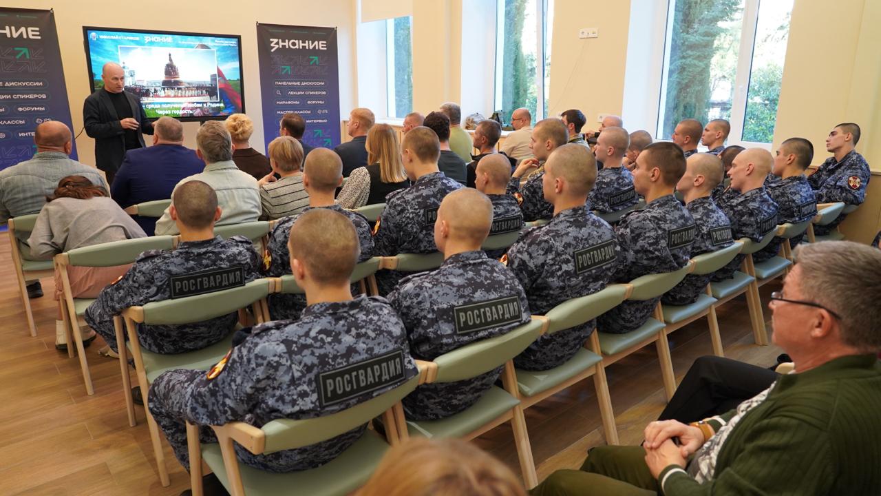 Чтобы в рамках проекта «Знание.Лекторий» в городской Точке кипения встретиться с военнослужащими Севастопольского полка Росгвардии и студентами СГУ.