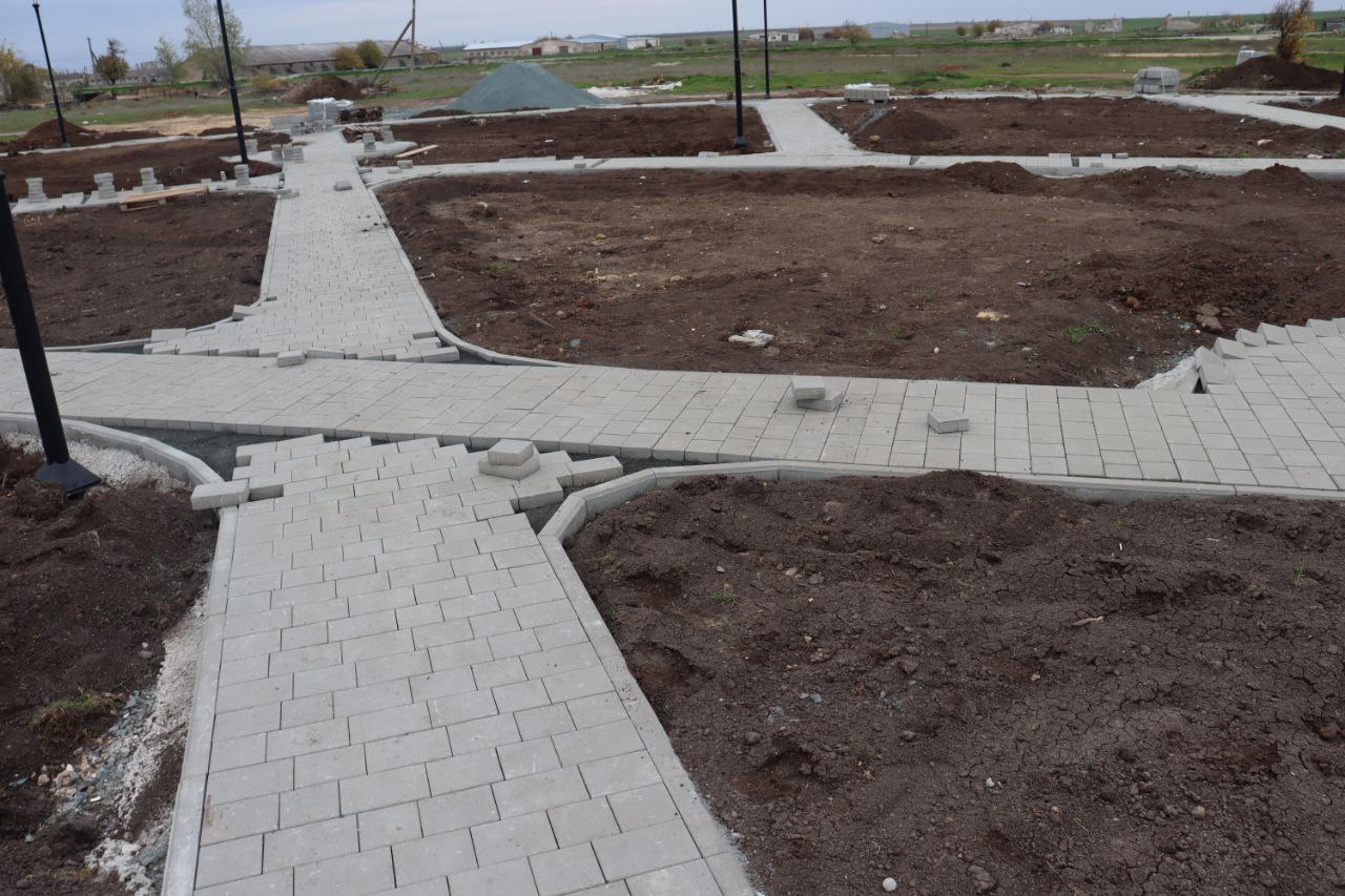 Сейчас ведется укладка тротуарной плитки, выполнено около 80%, запланирована установка лавочек с навесами, урн, уже установлено освещение, запланирована посадка 36 саженцев, посев газона и установка видеонаблюдения. Общая готовность составляет примерно 80%.