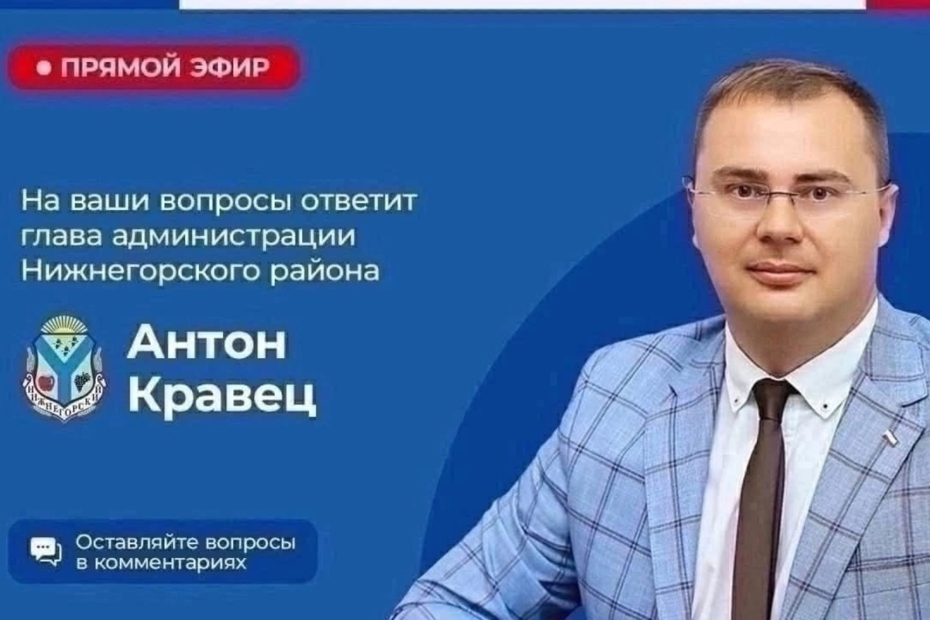Глава администрации района Антон Кравец проведет прямой эфир в социальной сети В Контакте 07 ноября в 14.00