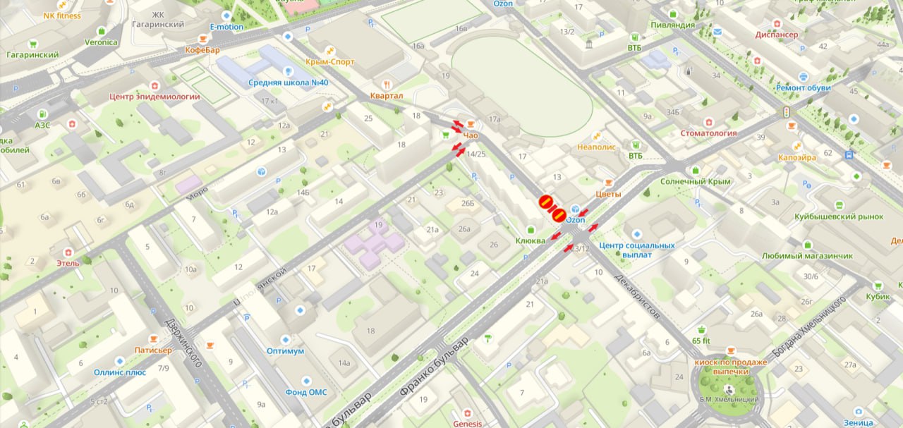 Фото: администрация Симферополя«В период с 7 ноября по 10 ноября вводится временное прекращение движения транспортных средств по участку улично-дорожной сети улицы Декабристов с перекрытием автодороги улицы Декабристов (от автодороги бульвар Франко вдоль здания № 14 по улице Декабристов)», — уточнили в администрации.