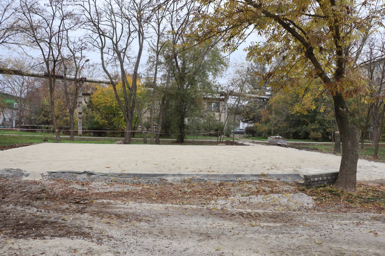Строители обозначили территорию поребриками, уложили геотекстиль, чтобы предотвратить прорастание травы, отсыпали основание из щебня и приступили к трамбовке материала. В ближайшее время начнется установка игровых элементов, после чего площадку зальют специальным резиновым покрытием.