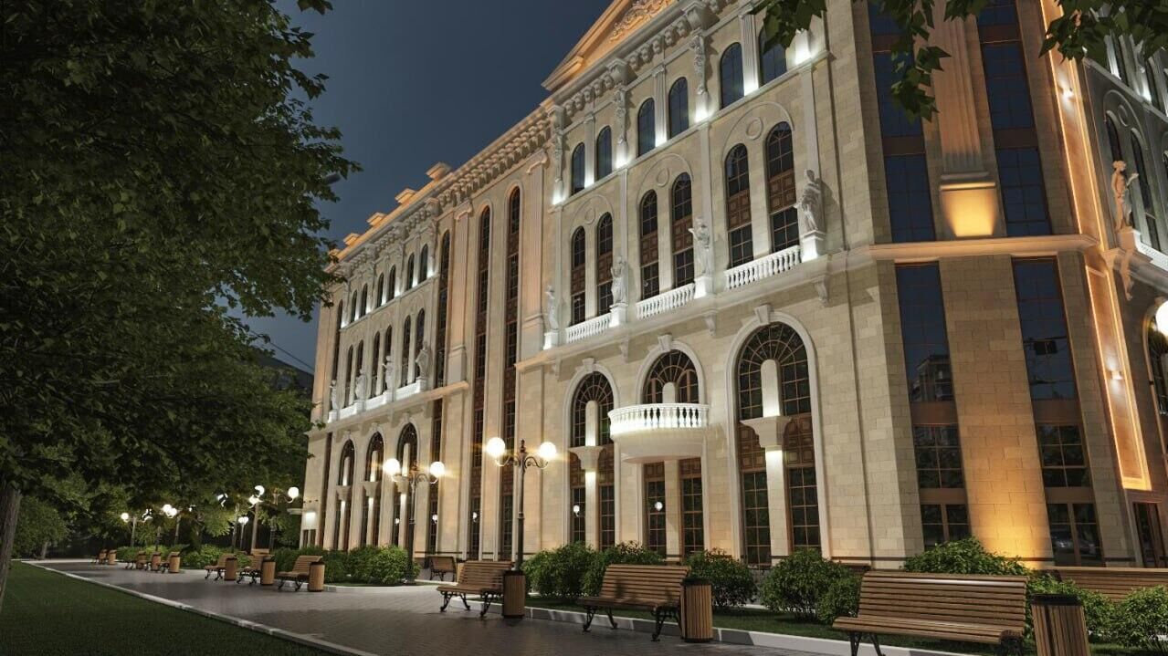Как сообщали в минстрое республики, проект не менялся с момента его изготовления в 2017 году. Пятно застройки небольшое – 58 на 26 метров, однако театр вырос вверх на шесть этажей, пять из которых видимые, один – подземный, где предусмотрен паркинг.