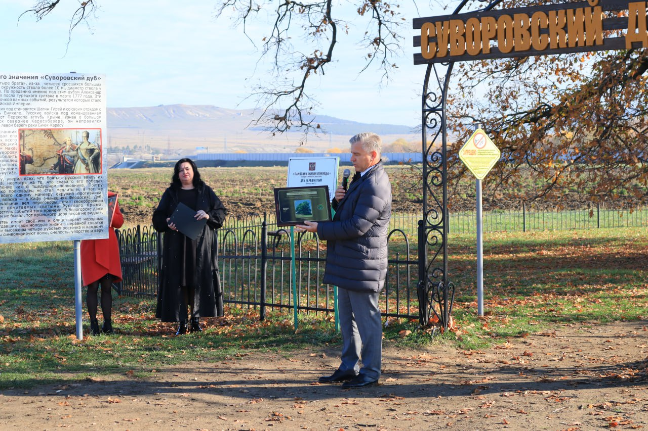Глава администрации Белогорского района Дмитрий Сергеевич Чумаков отметил, что Суворовский дуб — это не только природный долгожитель, но и хранитель исторической памяти. Место произрастания дерева связано с маршрутом войск Александра Васильевича Суворова во время одного из его переходов по Крымской земле. Дуб стал живым ориентиром той дороги и сохранился до наших дней.