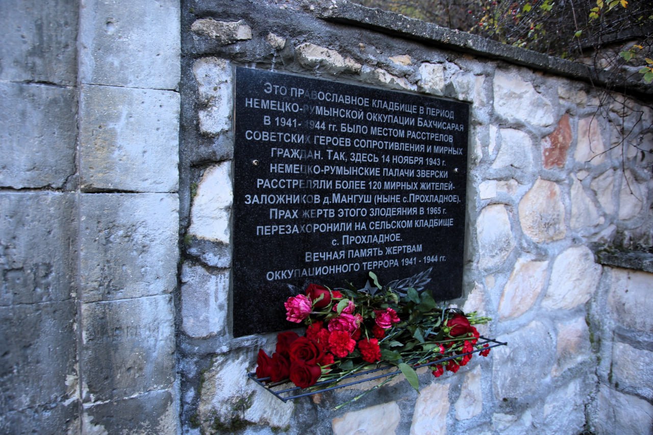 Текст мемориальной доски гласит: «ЭТО ПРАВОСЛАВНОЕ КЛАДБИЩЕ В ПЕРИОД НЕМЕЦКО-РУМЫНСКОЙ ОККУПАЦИИ БАХЧИСАРАЯ В 1941-1944 гг. БЫЛО МЕСТОМ РАССТРЕЛОВ СОВЕТСКИХ ГЕРОЕВ СОПРОТИВЛЕНИЯ И МИРНЫХ ГРАЖДАН. ТАК, ЗДЕСЬ 14 НОЯБРЯ 1943 г. НЕМЕЦКО-РУМЫНСКИЕ ПАЛАЧИ ЗВЕРСКИ РАССТРЕЛЯЛИ БОЛЕЕ 120 МИРНЫХ ЖИТЕЛЕЙ - ЗАЛОЖНИКОВ д. МАНГУШ (НЫНЕ с. ПРОХЛАДНОЕ). ПРАХ ЖЕРТВ ЭТОГО ЗЛОДЕЯНИЯ В 1965 г. ПЕРЕЗАХОРОНИЛИ НА СЕЛЬСКОМ КЛАДБИЩЕ с. ПРОХЛАДНОЕ. ВЕЧНАЯ ПАМЯТЬ ЖЕРТВАМ ОККУПАЦИОННОГО ТЕРРОРА 1941-1944 гг.».