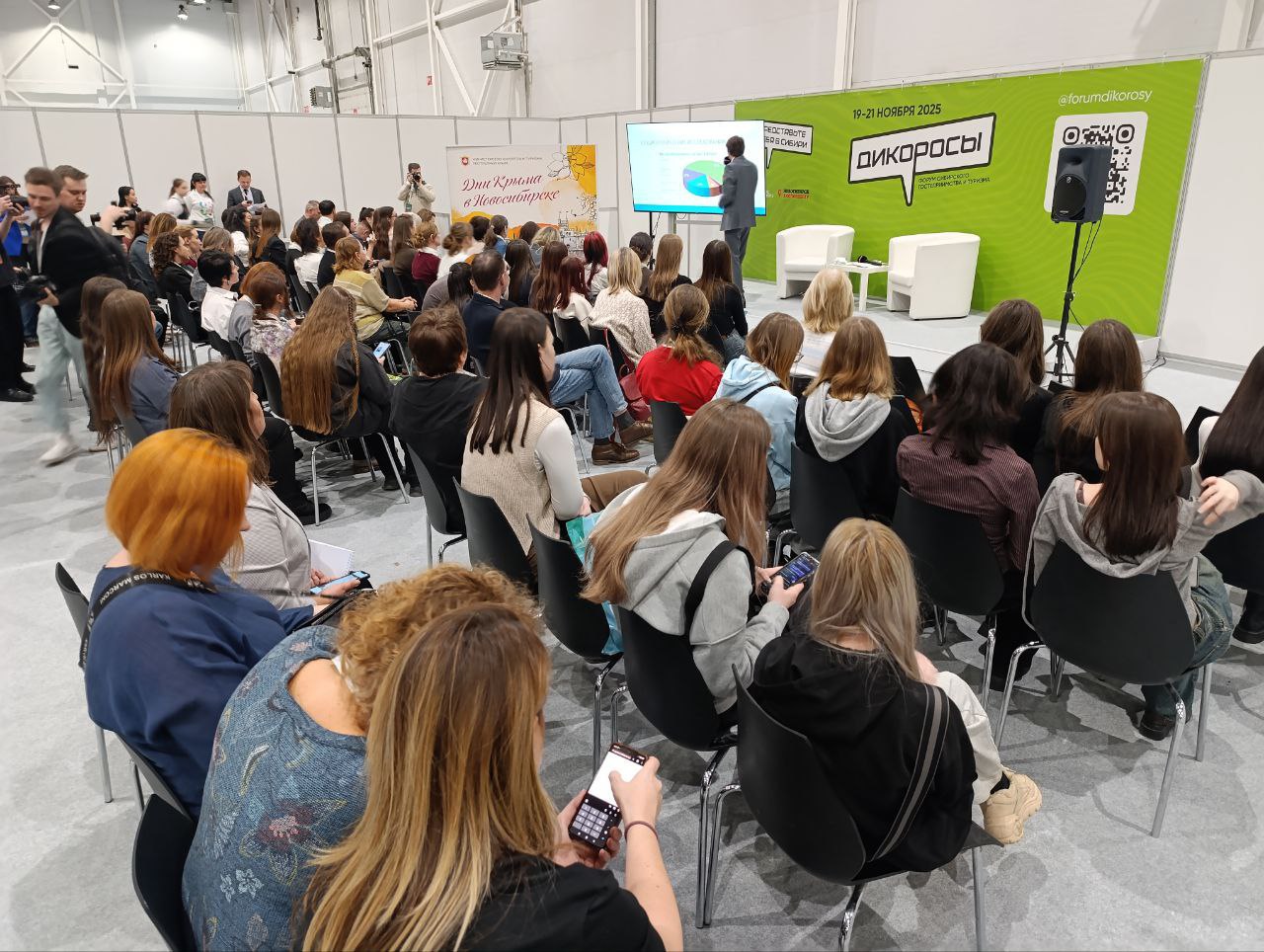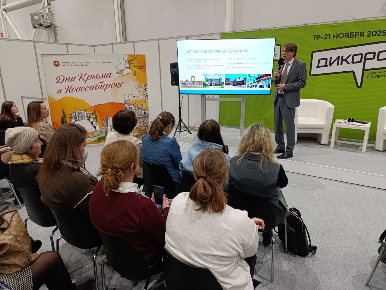 В рамках Форума-выставки «Дикороссы» делегация Крыма провела презентационные сессии «В Крым за впечатлениями», «В Крым за здоровьем» и «Отдыхай в Крыму» для турбизнеса Новосибирской области. Сибирякам презентовали чаи из горных трав, снеки из крымских морепродуктов по авторскому рецепту, паштет из печени улитки, крафтовые сыры с наполнителями из вина и лаванды, крымский рахат-лукум, розовое и инжирное варенье.