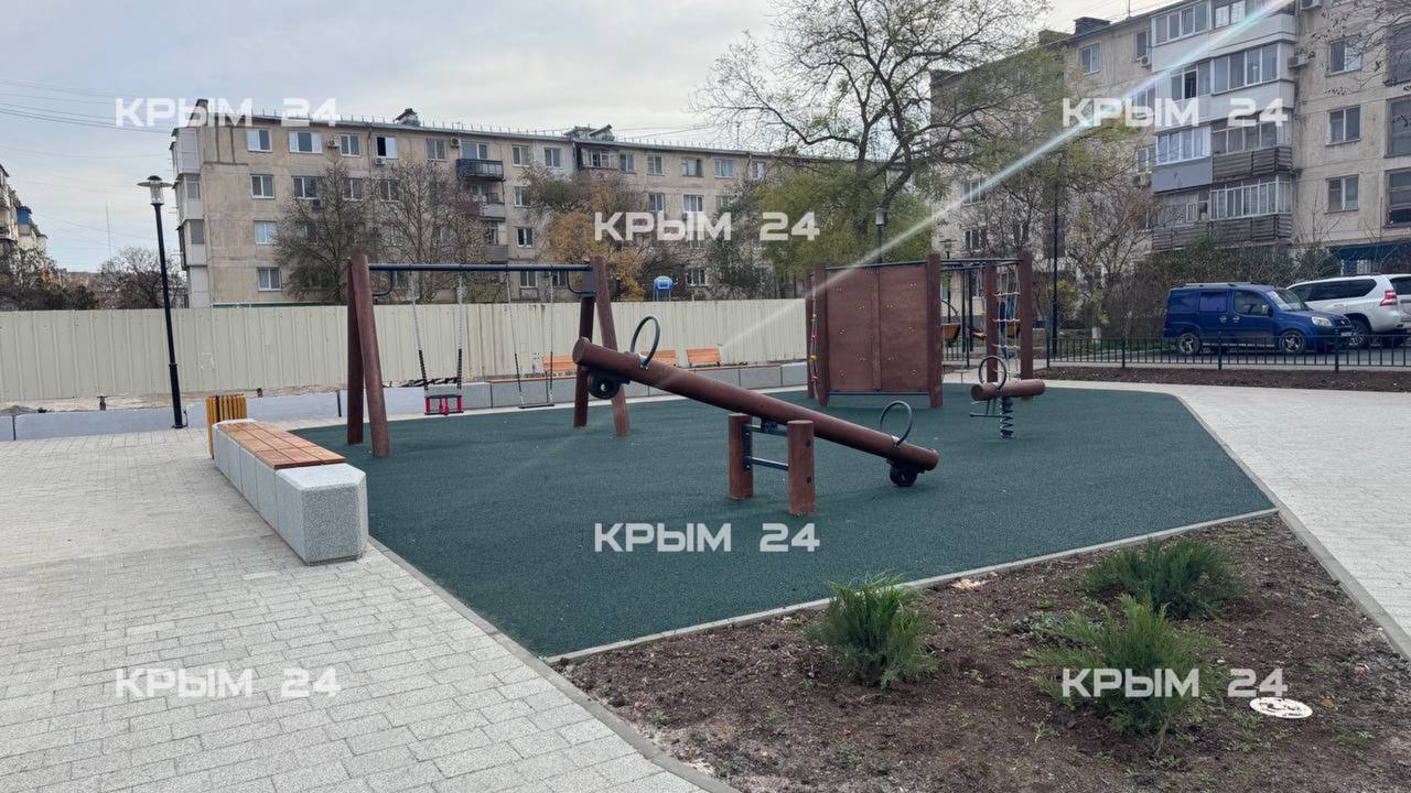 На территории установили качели с теневыми навесами, детскую площадку, обустроили тротуарные дорожки и клумбы.