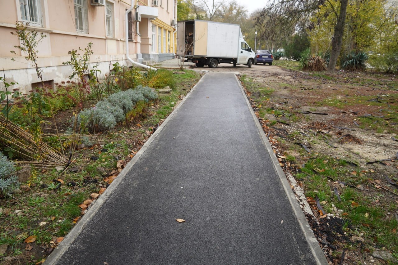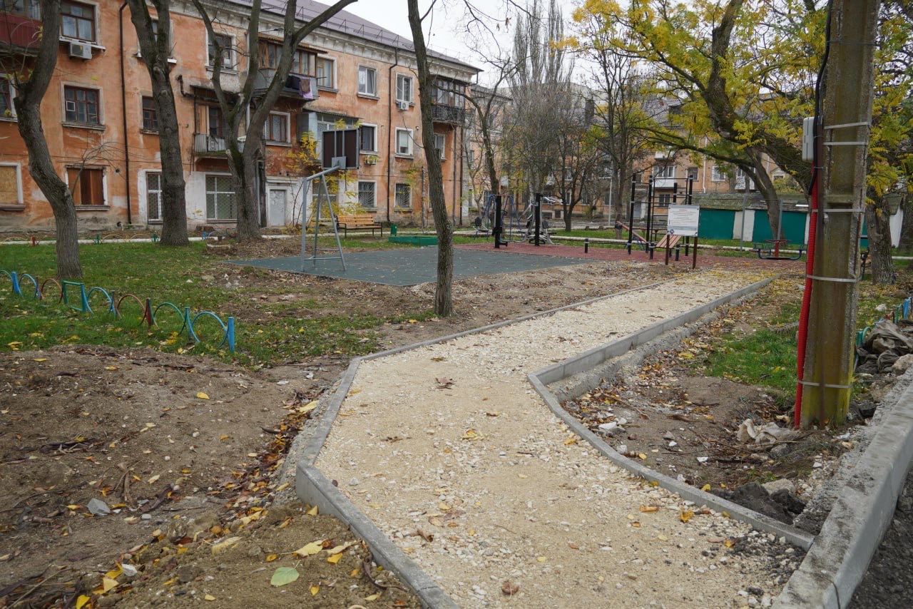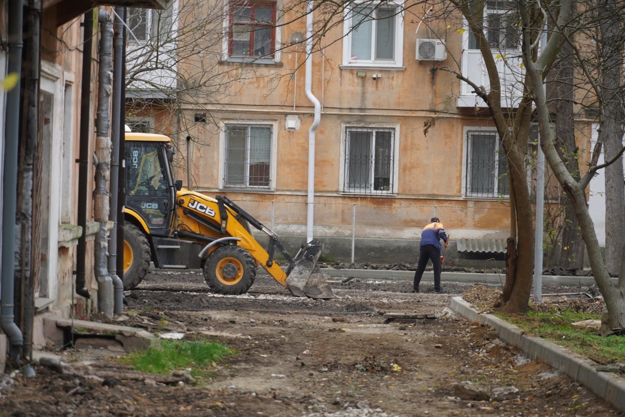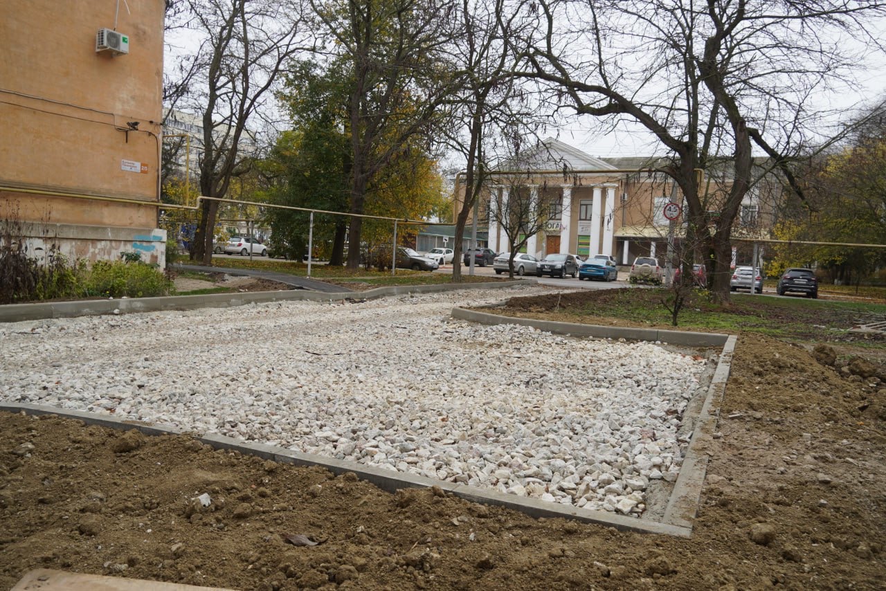Придомовая территория зонирована, установлены новые бордюры, заасфальтирована часть пешеходных зон, выполнена обрезка деревьев. Сейчас рабочие готовят к укладке асфальтобетонного покрытия внутренние проезды.