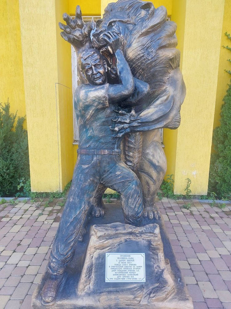 Скульптура, символизирующая борьбу Олега Зубкова со львом, стоит на входе в "Тайган"