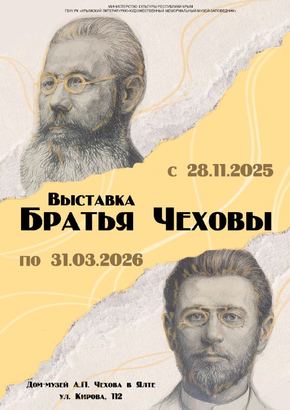 Новая временная экспозиция «Братья Чеховы» приурочена к знаковым датам в истории семьи: 170-летию со дня рождения старшего брата писателя Александра Павловича, и 160-летию младшего брата Михаила Павловича. Особое внимание уделено 200-летнему юбилею главы семейства — Павлу Егоровичу Чехову, чья роль в формировании талантов сыновей была ключевой. Именно от него, по словам самого Антона Павловича, дети унаследовали талант: «Талант в нас со стороны отца, а душа со стороны матери». Выставка раскрывает уникальную творческую атмосферу и всестороннюю поддержку, царившую в семье.