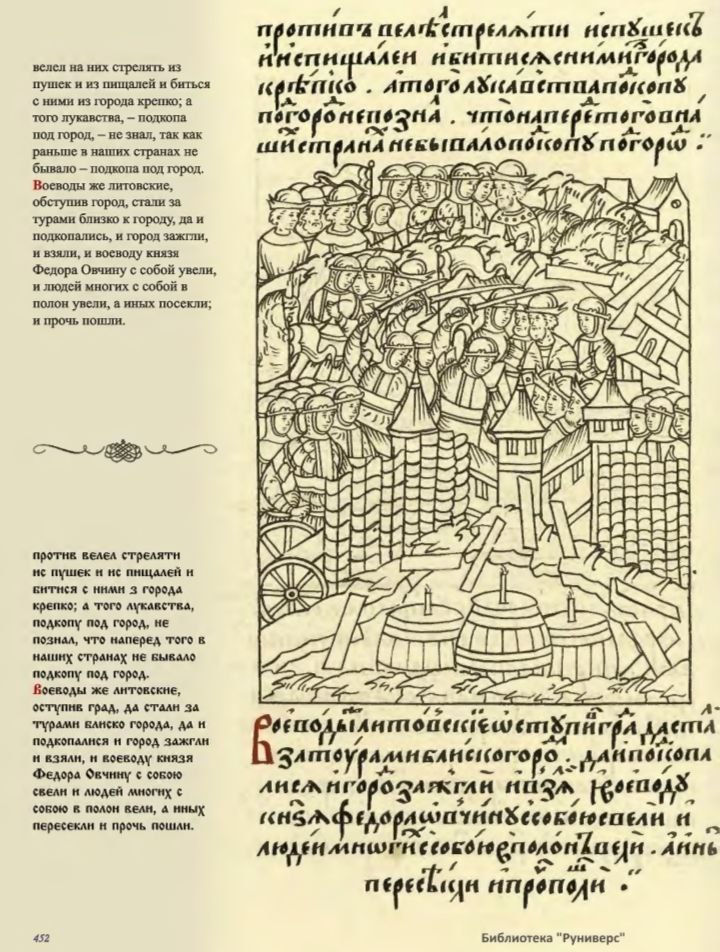 "В лето 7043 (1535)... Того ж месяца пришли литовские воеводы Торновской и иные многие воеводы со многими людьми ис под Гомья к Стародуби, да с ними великого князя изменник князь Семен Бельской. И стояли под городом пять недель, подкопывалися под стену под городовую, да, подкопався, город сожгли и воеводу князя Федора Васильевича Овчину Оболенского и иных воевод с собою свели и детей боярских, а иных детей боярских и чернь побишя безчислено много... "