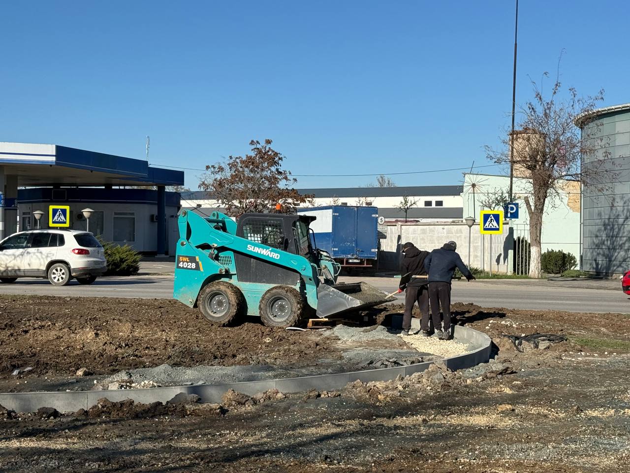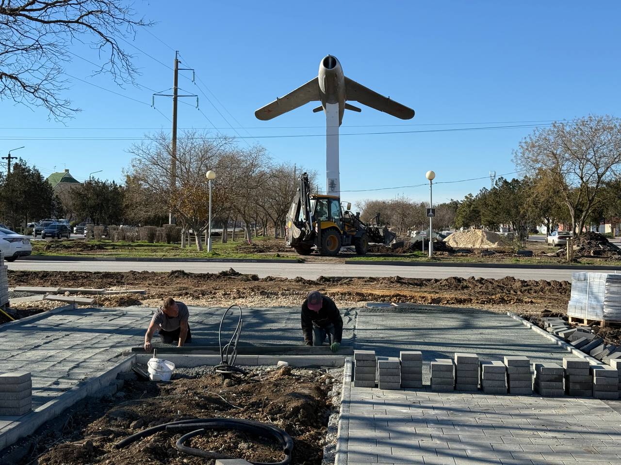 На участке за памятником авиаторам ВВС Черноморского флота продолжается демонтаж старого тротуарного покрытия, устанавливают бортовой камень, укладывают тротуарную плитку.
