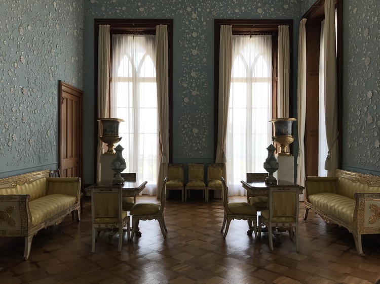 Заметим, Голубая гостиная - самое светлое помещение главного корпуса Воронцовского дворца. Она, за счет изящной художественной лепки крепостного Романа Фуртунова, заметно отличается от других парадных интерьеров. Сам же Воронцовский дворец в Алупке строили с 1828 по 1848 год по проекту английского архитектора Эдварда Блора для графа Михаила Воронцова, генерал-губернатора Новороссийского края.