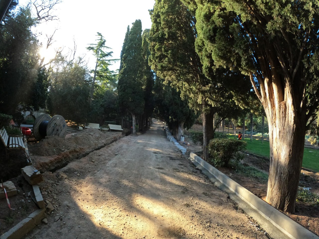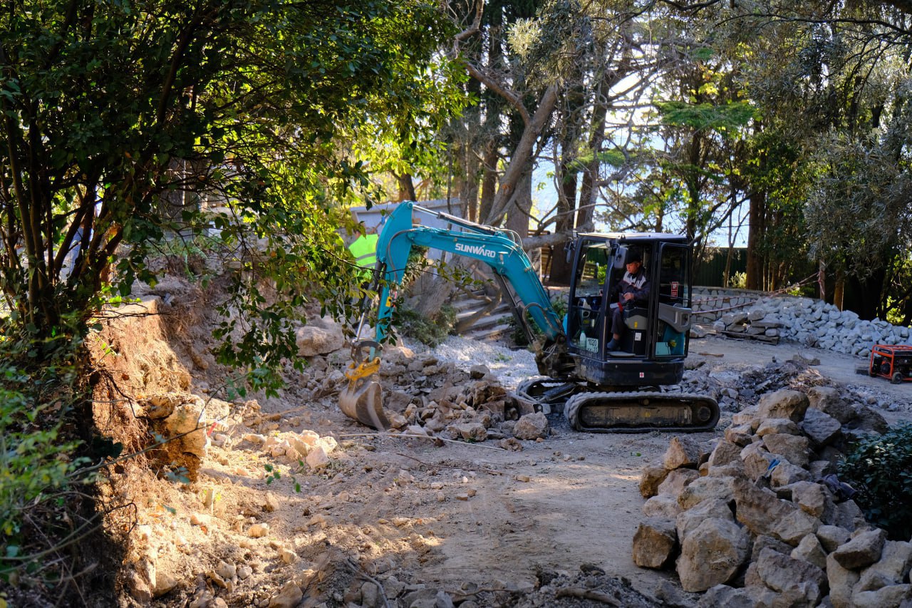 В настоящее время рабочие занимаются укладкой новых подпорных стен и коммуникаций, а также используют демонтированные бордюры для создания новых дорожек.