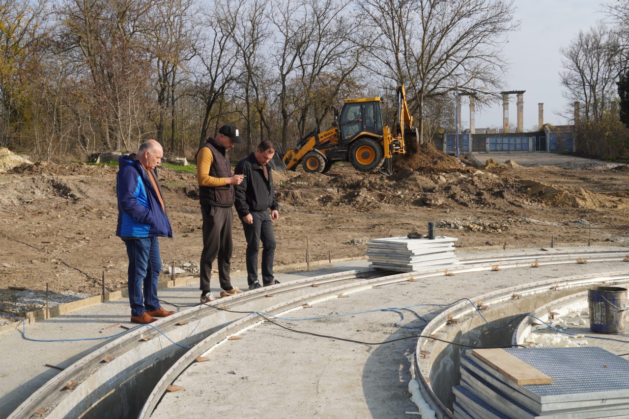 Продолжаются работы по устройству фонтана. Строители устанавливают металлические решетки на дренажные каналы. Следующим этапом станет облицовка конструкции и мощение пространства вокруг гидротехнического сооружения.