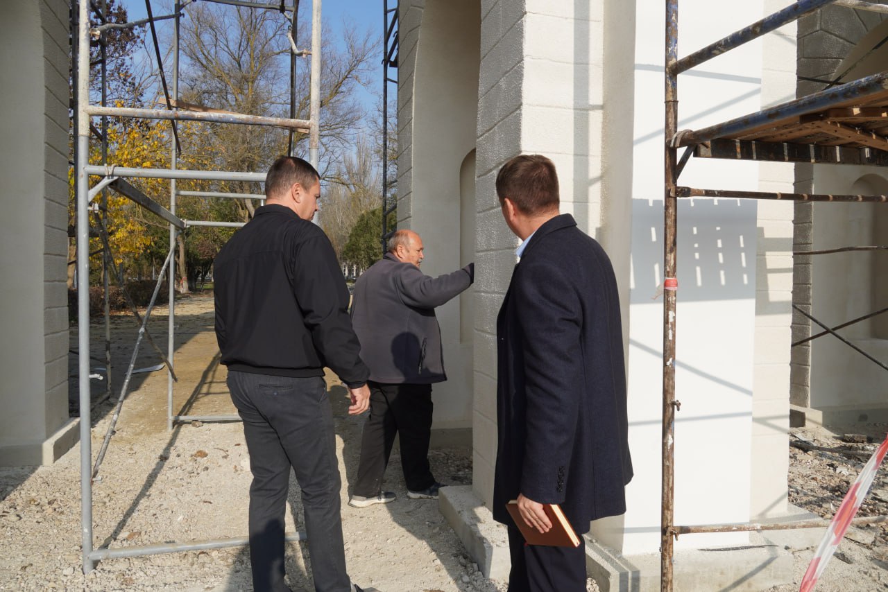 Завершаются работы по ремонту входной арки. Строители нанесли декоративную штукатурку. Как только она просохнет, приступят к покраске фасада. Олег Николаевич обсудил с подрядчиком цветовое решение: арка будет выкрашена в белый и песочный.