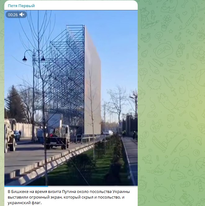 Во время визита Владимира Путина в Бишкек на саммит ОДКБ местные власти закрыли баннером посольство Украины с жёлто-синим флагом.