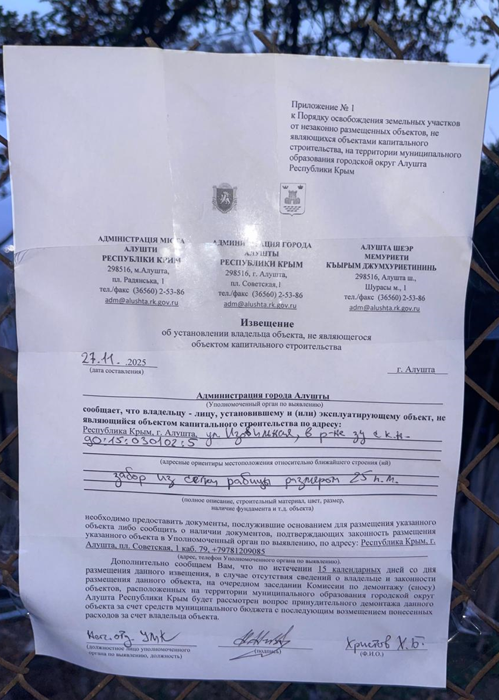 Дополнительно сообщаем Вам, что по истечении 15 календарных дней со дня размещения данного извещения, в случае отсутствия сведений о владельце и законности размещения данного объекта, на очередном заседании Комиссии по демонтажу (сносу) объектов, расположенных на территории муниципального образования городской округ Алушта Республики Крым будет рассмотрен вопрос принудительного демонтажа данного объекта за счет средств муниципального бюджета с последующим возмещением понесенных расходов за счет владельца объекта.