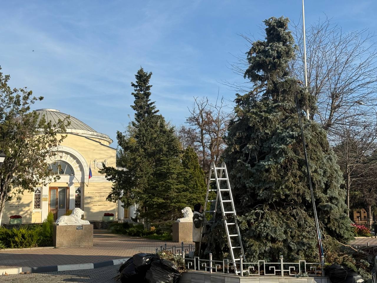 Ель на Театральной площади Евпатории готовят к зиме