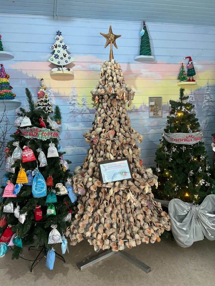 "Морская" елка из ракушек уже год стоит в музее подарков Деда Мороза. Фото предоставлено Николаем Помогаловым
