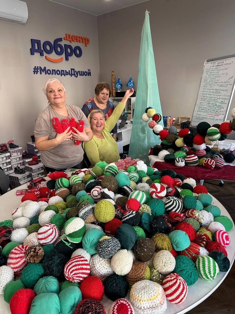 Шары для елки вязали сто "серебряных волонтеров" в возрасте 55+ . Фото: Экопарк "Лукоморье"/Vk