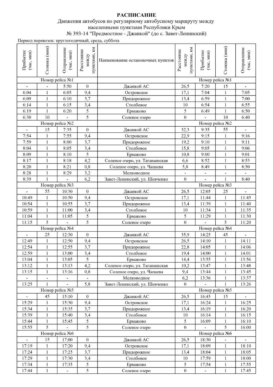 С 03 декабря 2025 года автобус по маршруту № 393-14 «Предмостное – Джанкой» (до с. Солёное Озеро) по средам и субботам в тестовом режиме будет осуществлять движение по предложенному графику.