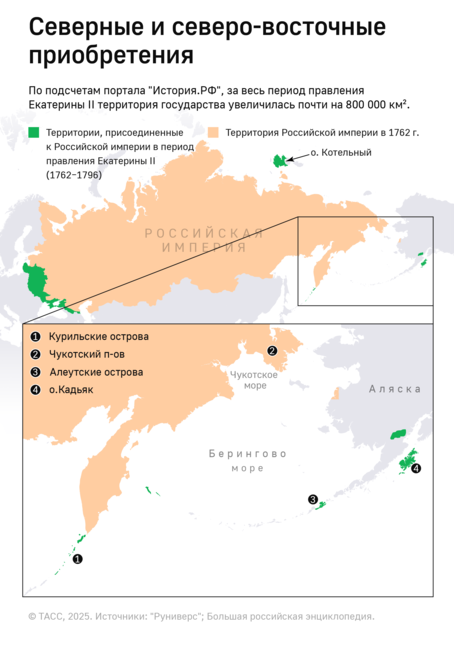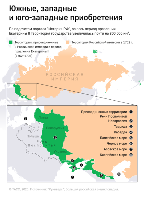 В величии Екатерины II, считает историк, есть три важных аспекта. Первый — это ее одновременные успехи как во внешней, так и во внутренней политике. Ее правление — это эпоха укрепления российской государственности, время относительной стабильности и политической, и экономической, и культурной. Но также это и время рекордного территориального расширения Российской империи.