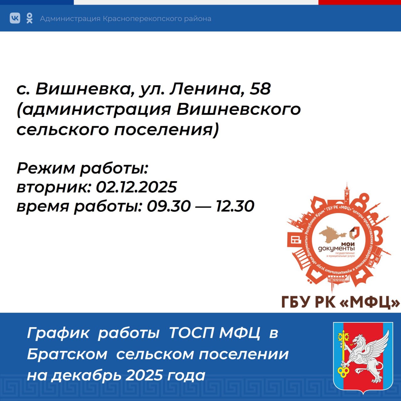 График работы территориальных обособленных структурных подразделений (ТОСП) "Многофункциональный центр предоставления государственных и муниципальных услуг" г.Красноперекопск (Красноперекопский район) на декабрь 2025 года