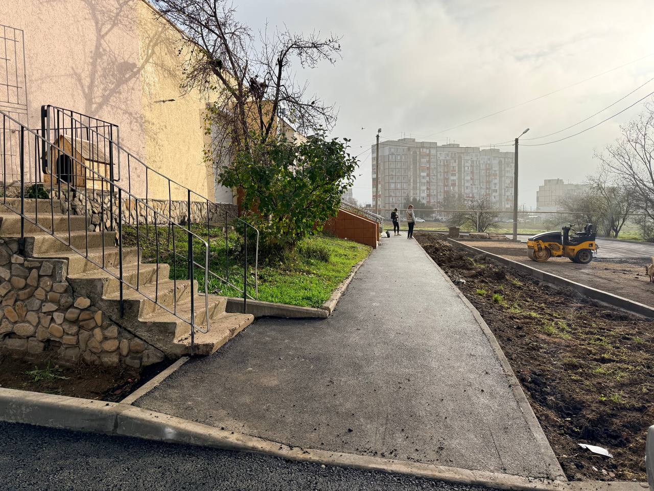 Параллельно строительная компания «Архонт» выполняет асфальтирование тротуаров и внутриквартальных проездов в нижней части двора. Особое внимание уделяют входным группам. Так, у первого подъезда дома № 23 по просьбе жителей оборудованы дополнительные ступени и плавный скат для мусорных контейнеров. Также специалисты постарались уменьшить угол наклона тротуара вдоль данного дома для безопасного передвижения керчан. У подъездов домов установили скамейки и урны, приступили к монтажу элементов и ограждения детских площадок в центре двора.