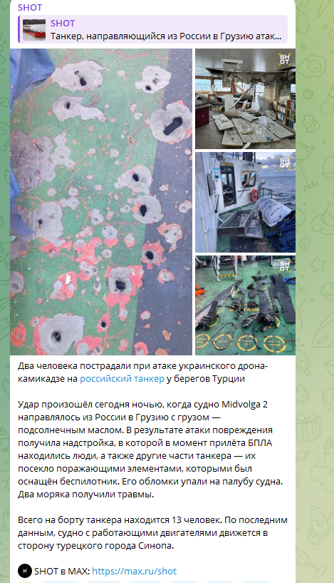 Сообщается, что в танкер ударил украинский воздушный беспилотник с взрывчаткой (отметим, что были ранены несколько членов экипажа). Судно сумело продолжить путь, но уже не по маршруту – получив повреждения, оно направилось в Турцию.
