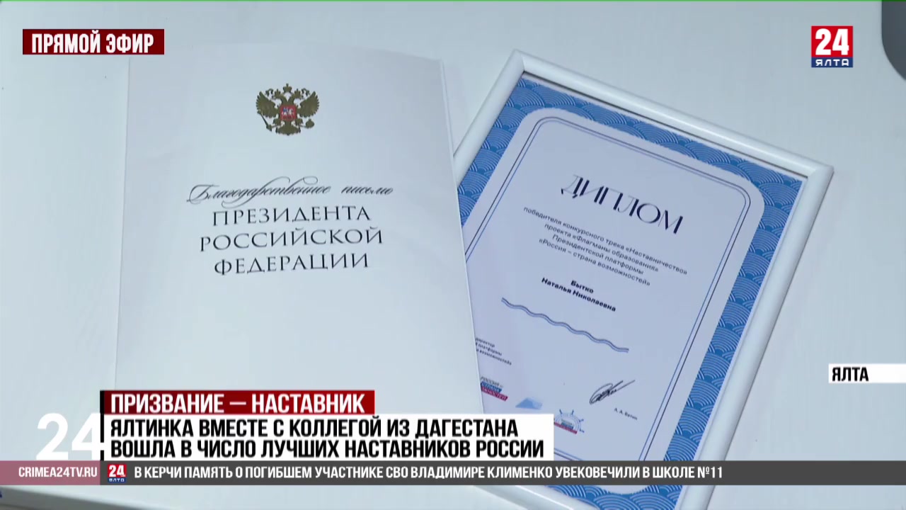 Ялтинский педагог вошла в число лучших наставников России. Вместе с коллегой из Дагестана Наталья Бытко лидировала в конкурсном треке проекта «Флагманы образования». Учителя разработали инициативу, посвящённую сотрудничеству специалистов двух республик. Об обмене опытом – сюжет корреспондента телеканала «Крым 24» Никиты Аброчнова.