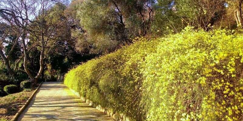 На первое место ботаник ставит зимоцвет или химонантус – кустарник, который цветет симпатичными среднего размера очень ароматными желтыми цветками. Достаточно скромно выглядящее на фоне бурной южнобережной природы растение не производит впечатление ни летом, ни в межсезонье, а вот зимой открывается вся его душистая прелесть.