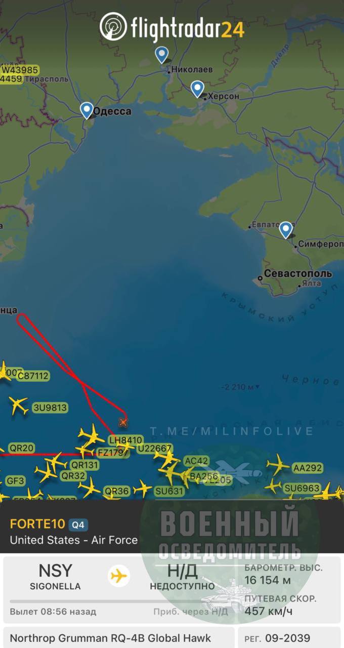 Сегодняшняя рутинная работа стратегического разведчика ВВС США RQ-4B Global Hawk (позывной - FORTE 10), уважаемых американских партнеров в нейтральных водах Черного моря в районе Крыма.