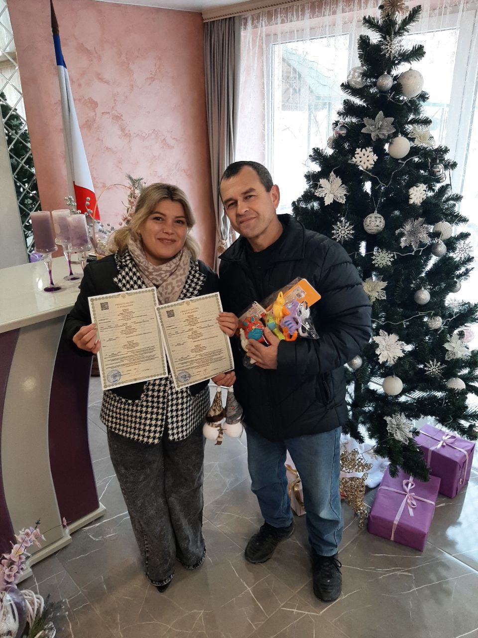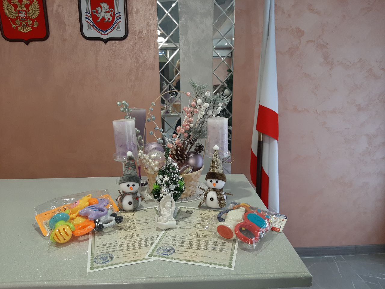 Родителям вручили первые документы Адиза и Амира – свидетельства о рождении и символические подарки.