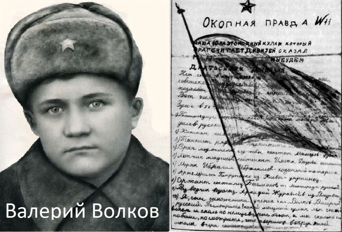 13-летний Валерий Волков после смерти отца стал «сыном полка» 7-ой бригады морской пехоты. Наравне со взрослыми участвовал в боевых действиях. Выпускал боевой листок «Окопная правда». В июле 1942 года в районе Ушаковой балки, отражая атаку противника, героически погиб, бросив гранату под наступающий танк.