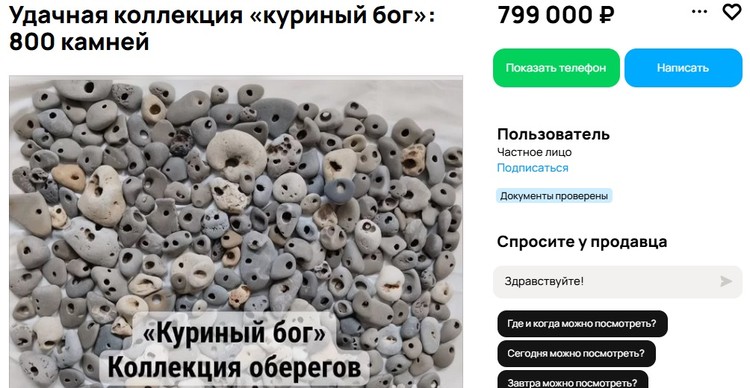 С целой коллекцией каменных оберегов готов расстаться житель Ялты. 800 камней со сквозными отверстиями, которые у славян именовались «куриным богом» и считались оберегом домашней птицы, мужчина собирал на побережье 16 лет. Теперь продает их за 800 тысяч рублей.