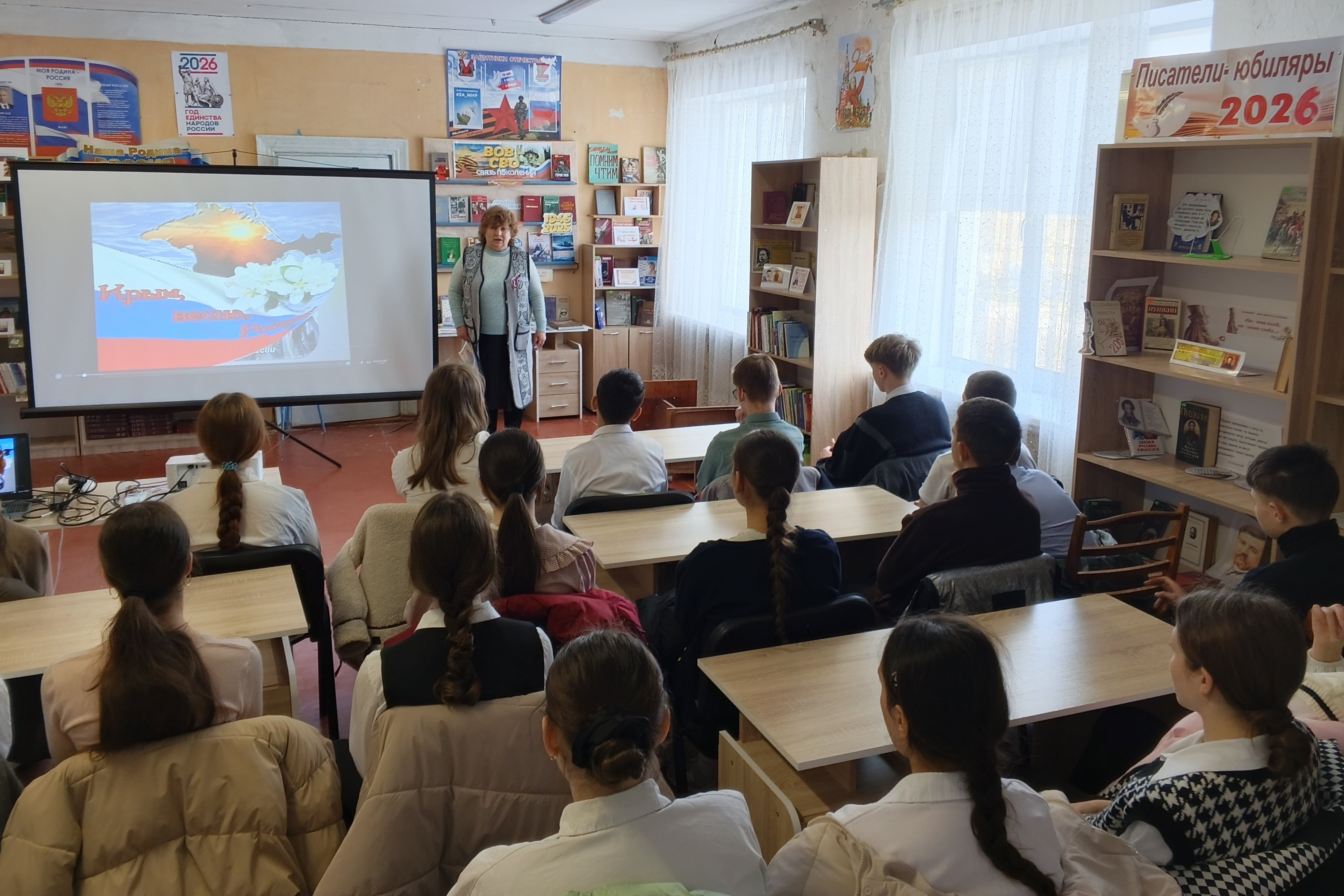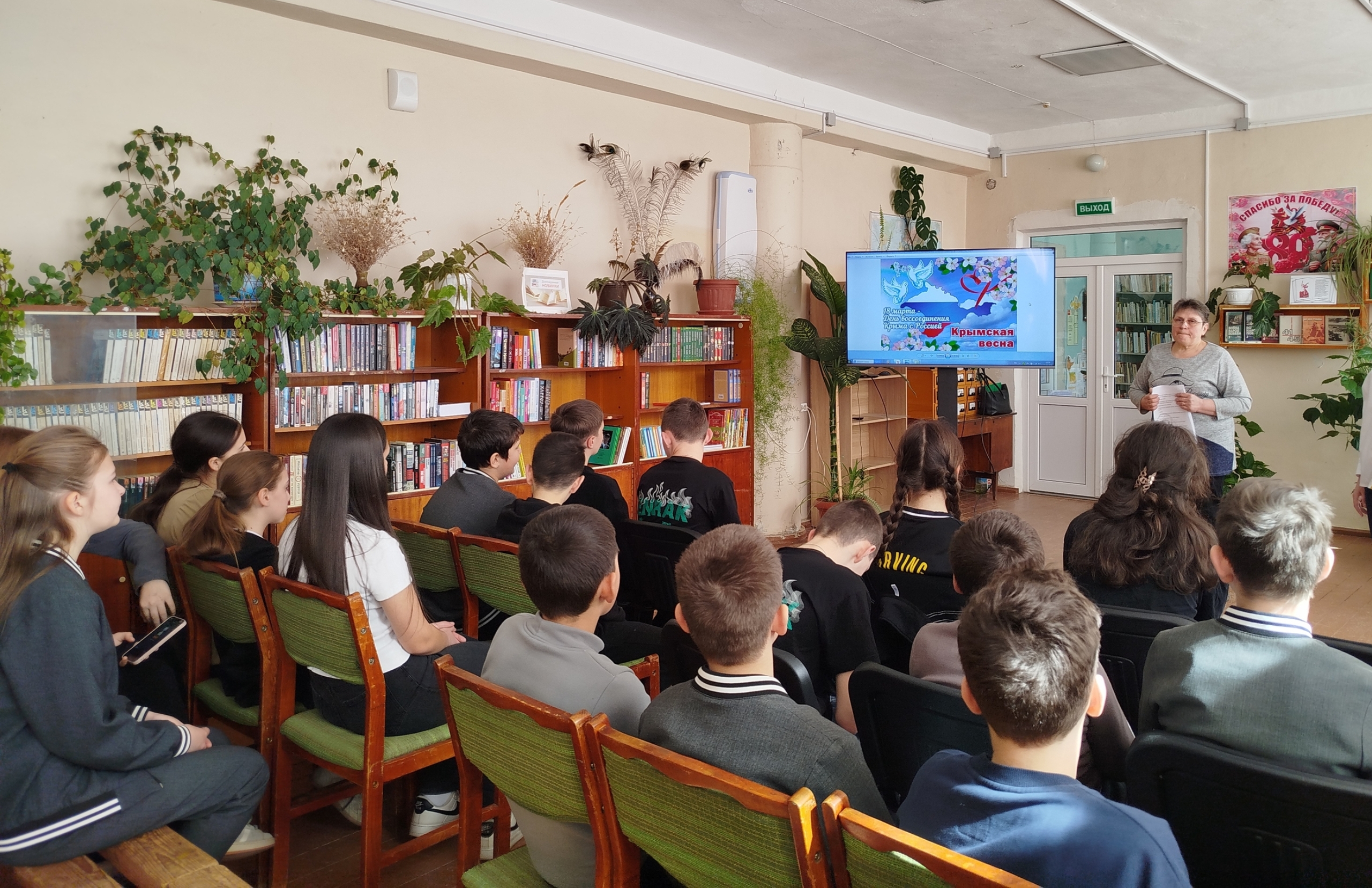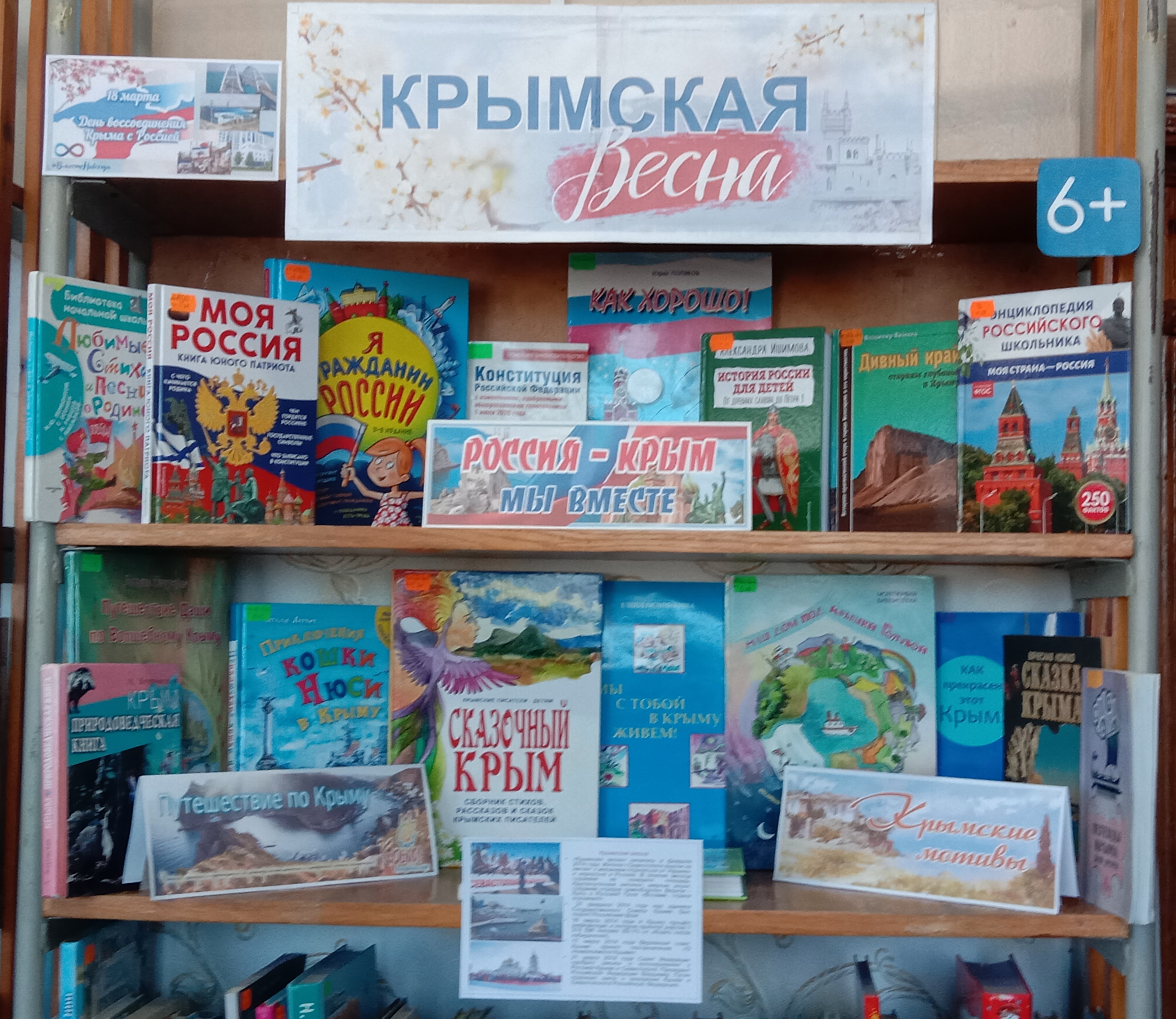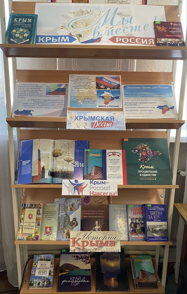 К этим значимым датам прошли исторические, патриотические и краеведческие часы, беседы и оформлены тематические книжные выставки: «Крымчане сделали свой выбор», «Крым в истории России», «Россия и Крым – общая судьба», «Историческое путешествие по Крыму», «Мой Крым – земли Российской украшение», «Крым – Россия, навсегда!», «Мой Крым – моя Россия!».