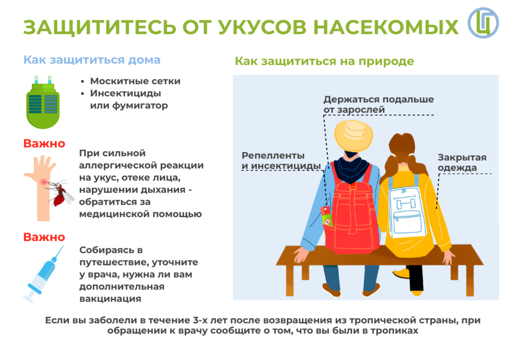 Допустимо использовать специальные химические средства для накожного применения и обработки одежды в целях отпугивания и уничтожения насекомых, но применять данные средства необходимо строго по инструкции или в соответствии с этикеткой, в которой описан способ применения и меры предосторожности.