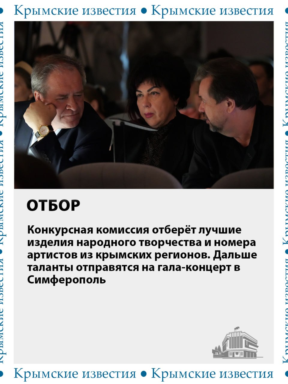 «Смотр-конкурс проходит под девизом “Крым многонациональный”. В каждом муниципалитете комиссия фестиваля знакомится с народным творчеством местных жителей. Крымчане представляют как изделия народного творчества, так и концертные номера», – рассказал «Крымским известиям» заместитель председателя ГС РК, глава Комитета ГС РК по культуре, охране культурного наследия и спорту Алла Пономаренко.