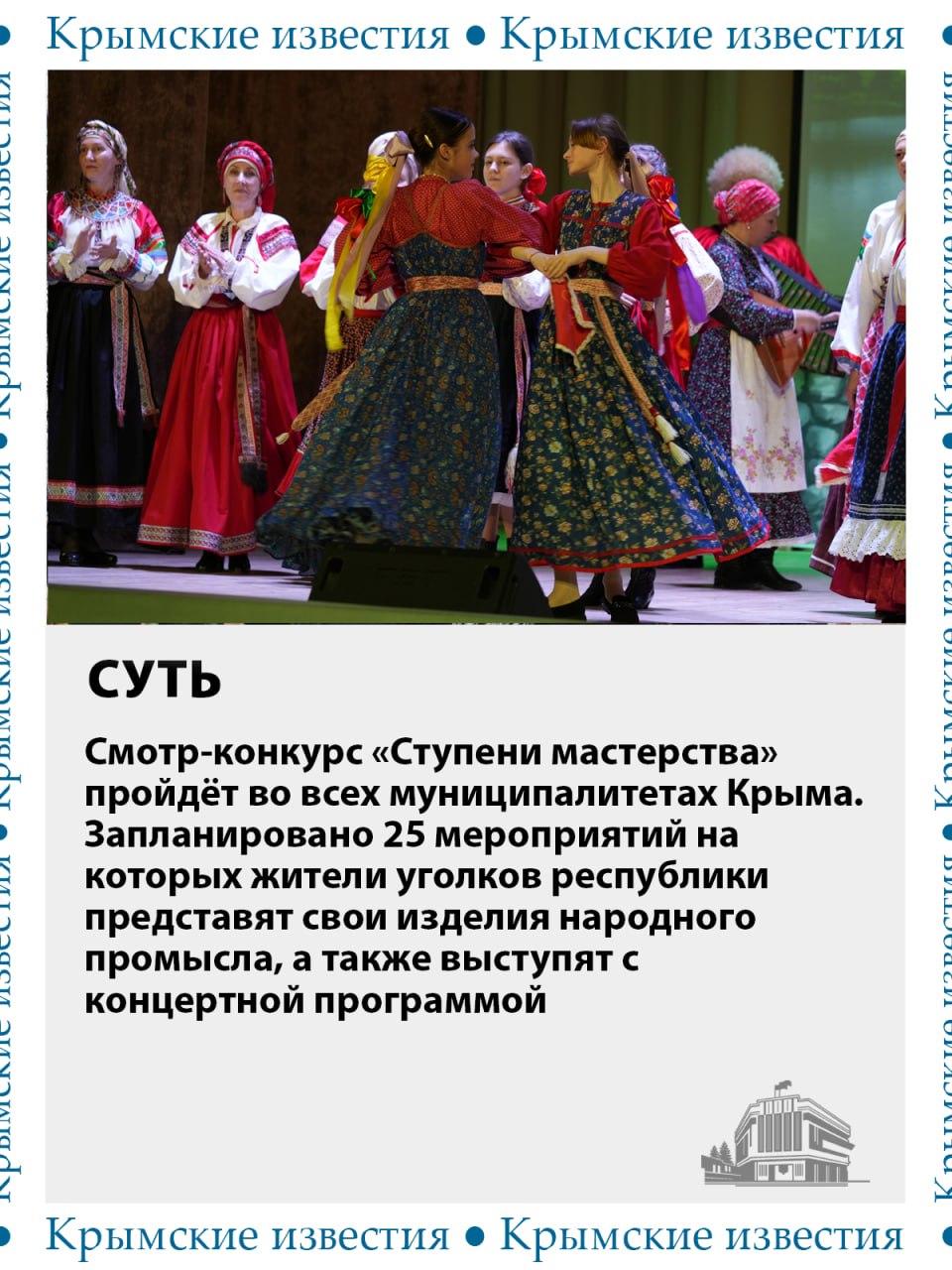 Фестиваль «Ступени-мастерства» стартовал в Крыму. Масштабный смотр-конкурс любительского искусства проходит во всех уголках республики и охватит все грани народного творчества – от ремесленных изделий до творческих номеров.