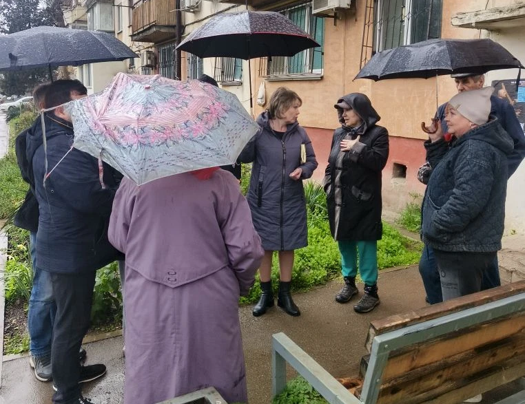 Также с участием Эльдара Муждабаева и Вероники Ойкиной прошла встреча по ул. Айвазовского, 40, на которой собравшиеся обсудили вопросы о проведении УК работ по тампонированию оконных проемов, об установке искусственной неровности.