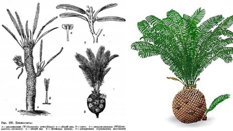 Сами беннеттиты – это что-то среднее между пальмой и папоротником, только с цветами. Ученые всерьез рассматривают древние растения как возможные прародители современных цветковых деревьев. Вполне возможно, это предки роз, тюльпанов и яблони, которые мы знаем сегодня. Внешне они напоминали невысокие деревья с пучком листьев на макушке.